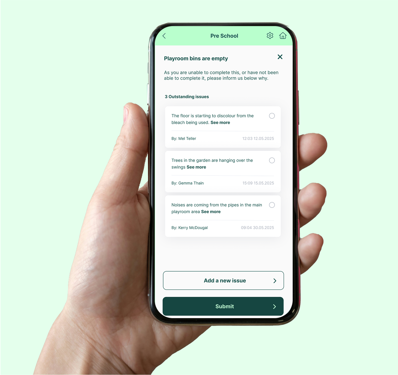 Tudu empowers staff to raise concerns instantly - whether it’s a broken latch, hygiene hazard, or safeguarding risk. The faster you respond, the safer your setting stays.